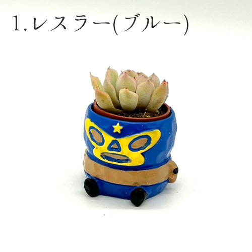 ミニサイズ(1.5号~2号程度)の植物を植えて楽しむ鉢カバーとランダムでついてくる多肉植物のセットです。ポットは底穴なしタイプ。オフィスや勉強机など、ちょっとした空間で多肉と推し動物を楽しむことができます。ポップなレスラーと癒しのはにわからお選びいただけます。水やりはこまめな霧吹きか少量の水でOK!