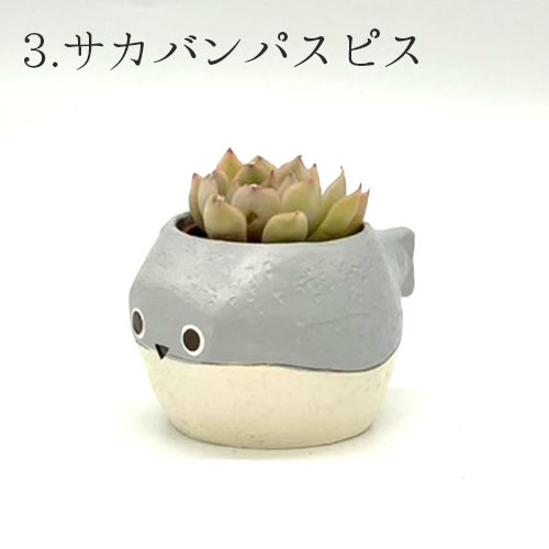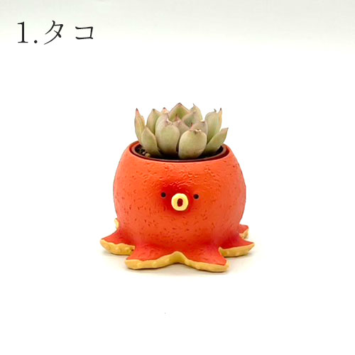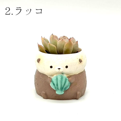 ミニサイズ(1.5号~2号程度)の植物を植えて楽しむ鉢カバーとランダムでついてくる多肉植物のセットです。ポットは底穴なしタイプ。オフィスや勉強机など、ちょっとした空間で多肉と動物を楽しむことができます。きょとんと可愛いタコとプカプカ浮かぶラッコ、伝説の古代魚サカバンパスピスからお選びいただけます。水やりはこまめな霧吹きか少量の水でOK!
