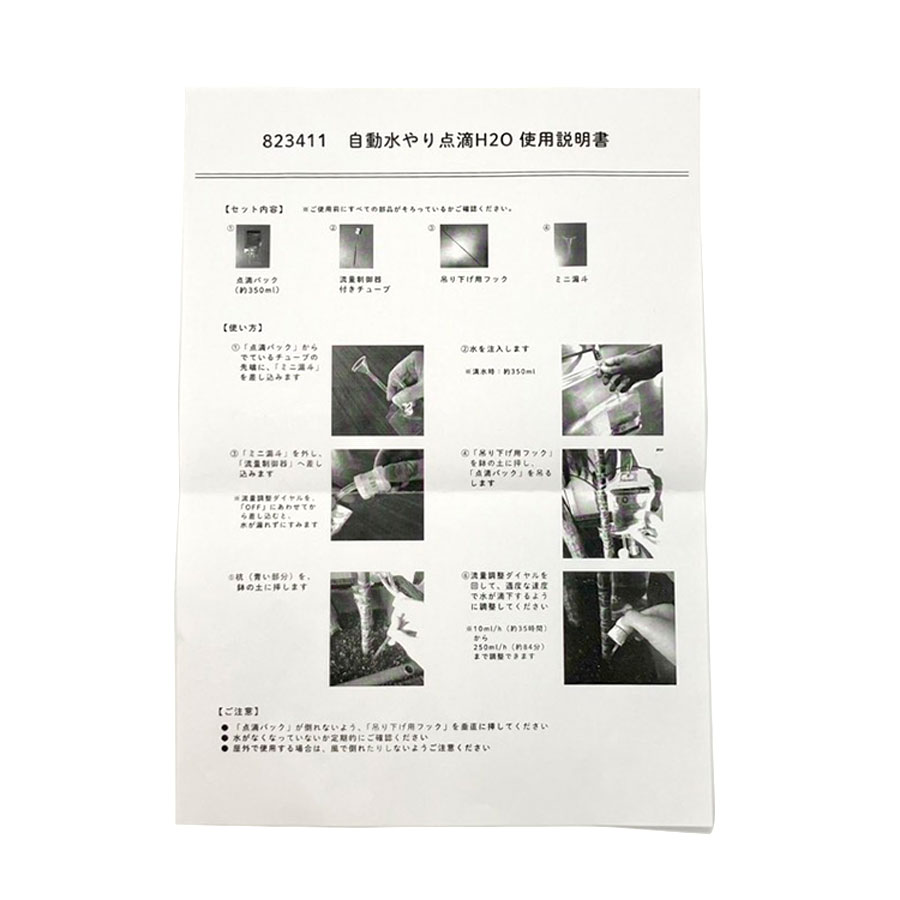 | 内容:点滴パック、流量制御器付きチューブ、吊り下げ用フック、ミニ漏斗 | |