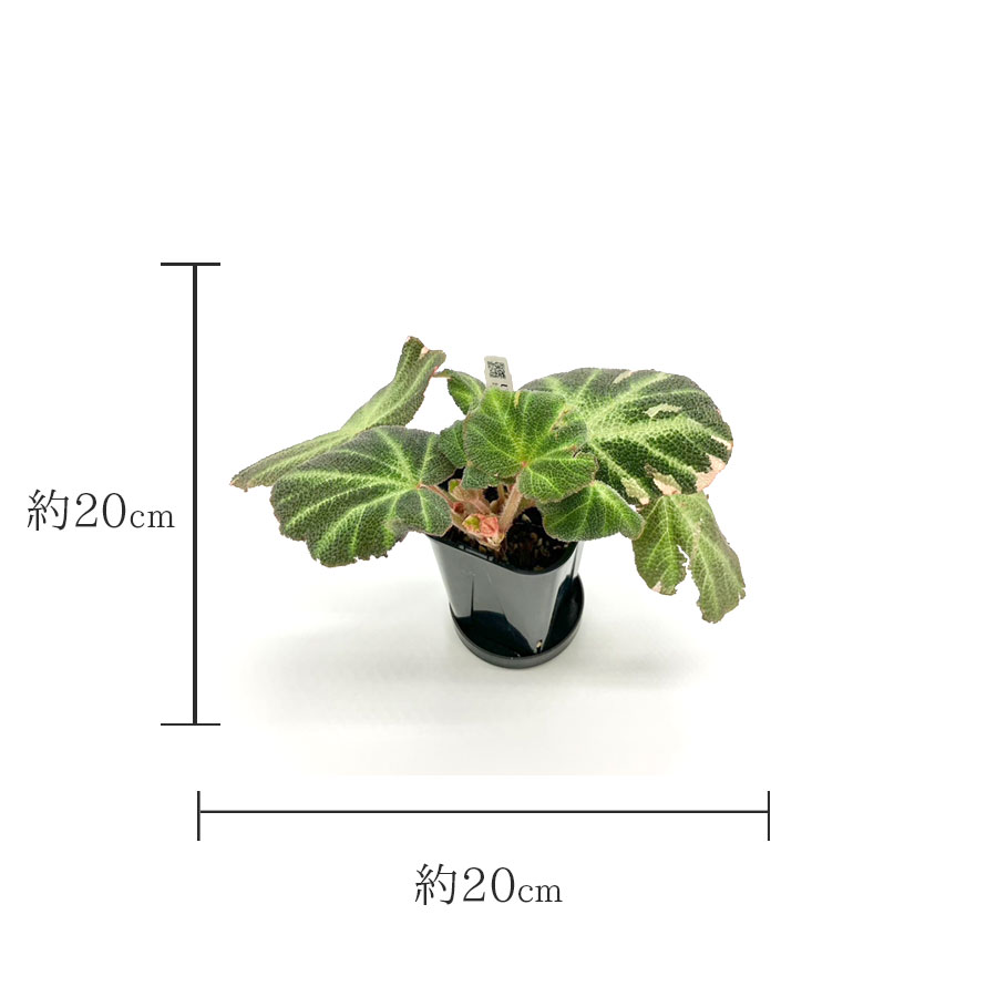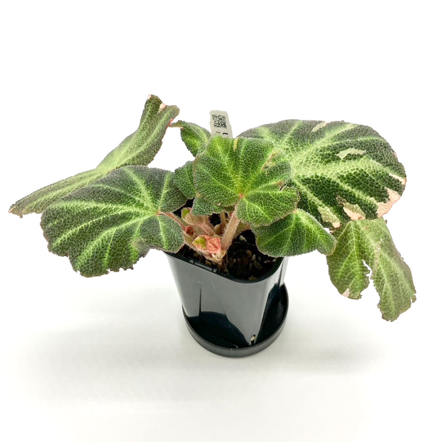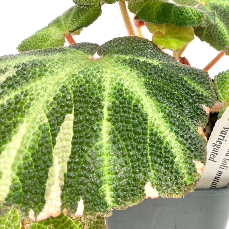 葉に特徴的なクロス模様が入った Begonia soli-mutata。この品種はさらに希少な「班入り」のVariegatedタイプです。葉の全体に白やピンクの班が印象的に入ります。夏場は班が薄くなっていくと言われています。プレステラ90の深鉢入りです。