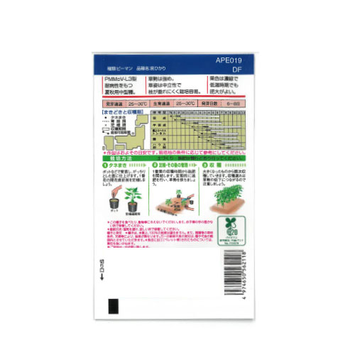 真夏から低温期まで安定して収穫できる夏秋ピーマンです。ウイルス病に強いのが特徴。味わいもよいです。