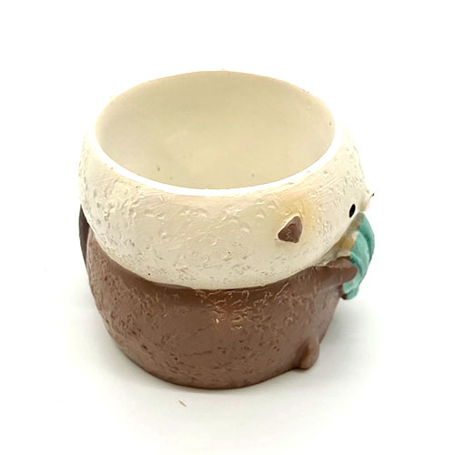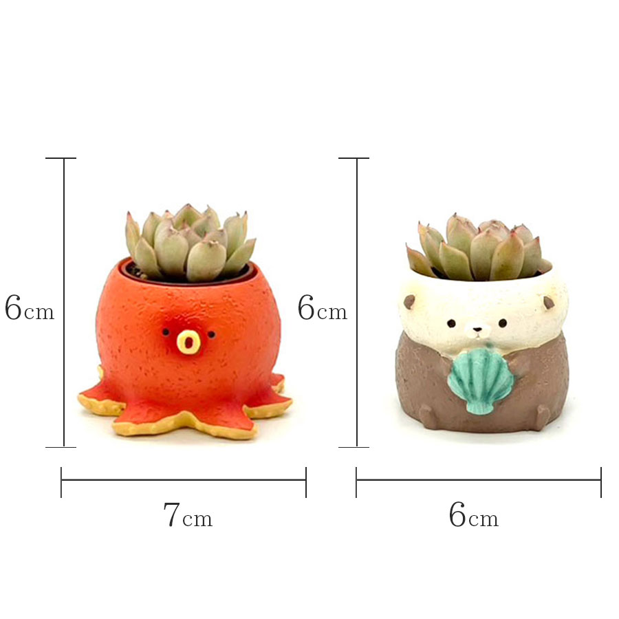 ミニサイズ(1.5号~2号程度)の植物を植えて楽しむ鉢カバーとランダムでついてくる多肉植物のセットです。ポットは底穴なしタイプ。オフィスや勉強机など、ちょっとした空間で多肉と動物を楽しむことができます。きょとんと可愛いタコとプカプカ浮かぶラッコ、伝説の古代魚サカバンパスピスからお選びいただけます。水やりはこまめな霧吹きか少量の水でOK!