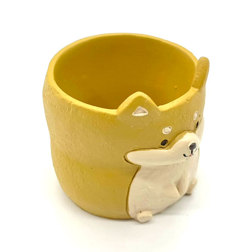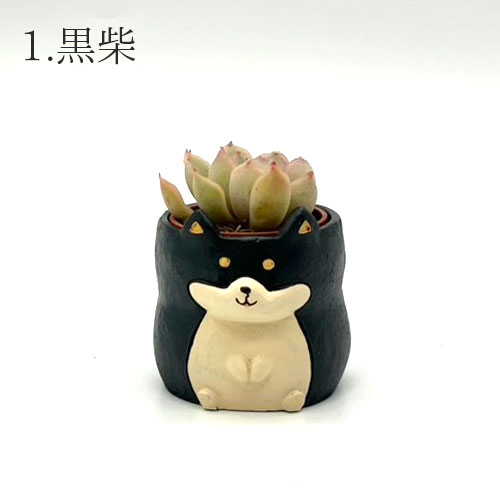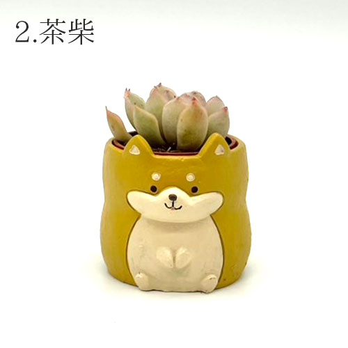ミニサイズ(1.5号~2号程度)の植物を植えて楽しむ鉢カバーとランダムでついてくる多肉植物のセットです。ポットは底穴なしタイプ。オフィスや勉強机など、ちょっとした空間で多肉と動物を楽しむことができます。黒柴と茶柴からお選びいただけます。水やりはこまめな霧吹きか少量の水でOK!