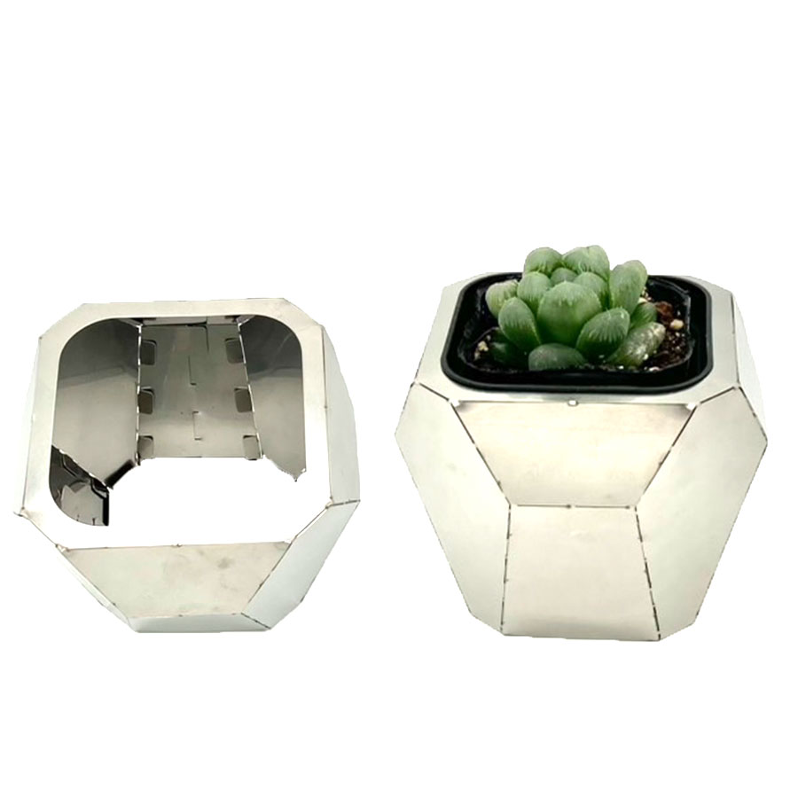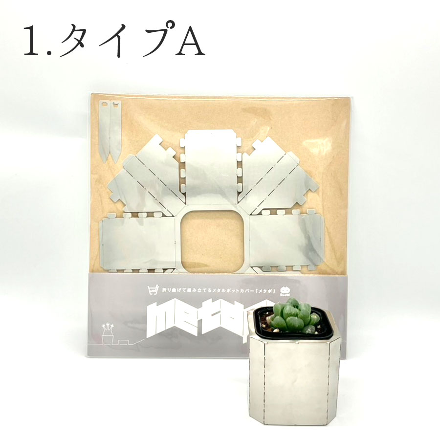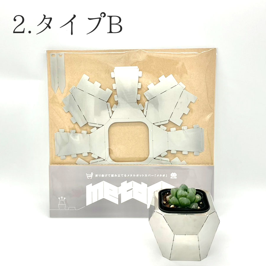 折り曲げて組み立てる新感覚のメタルポットカバーです。3号のプレステラがすっぽりと収まるサイズ感。自分で組み立てるユニークな鉢カバー。メタリックで珍しいデザイン性は塊根植物やアガベとの相性も抜群です。3種類のデザインはA→B→Cの順番で複雑になり難易度は上がります。