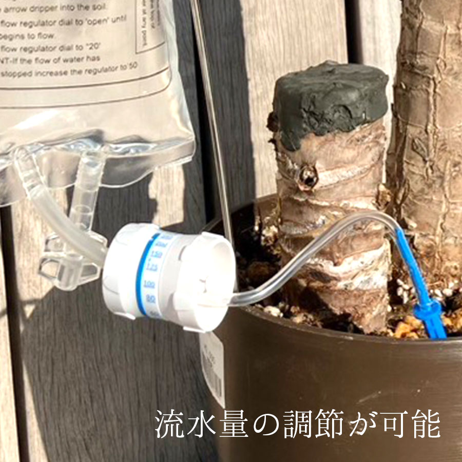 点滴パック型の自動水やりです。今以上に植物への愛着が湧くユニークなデザイン。水量調整もできるので、季節や植物に応じて楽しく管理することができます。吊り下げフック付きのスタンドもセット。