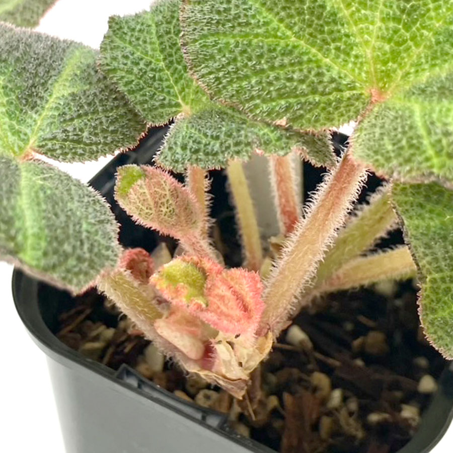 葉に特徴的なクロス模様が入った Begonia soli-mutata。この品種はさらに希少な「班入り」のVariegatedタイプです。葉の全体に白やピンクの班が印象的に入ります。夏場は班が薄くなっていくと言われています。プレステラ90の深鉢入りです。