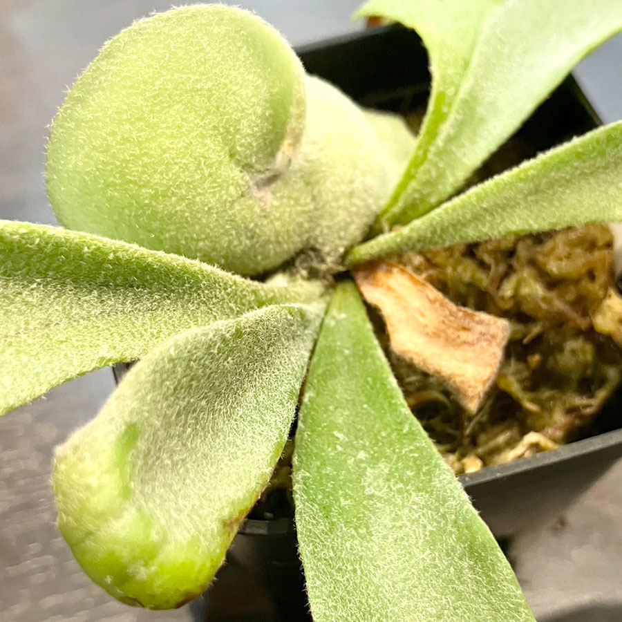 ビカクシダ ウィリンキー・コットンクラウドです。白味が強く肉厚な胞子葉が可愛らしい品種。フワフワの星状毛も人気のポイント。せっかくの星状毛が剥がれてしまうため、水やりやソーキングには注意が必要です。着生前のポットタイプです。